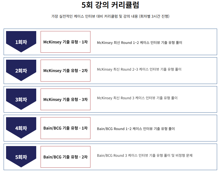 - 최신 MBB(McKinsey, Bain, BCG) 기출문제(Round1~3, 2023-2025년)를 강사와 함께 풀며 명확한 가이드라인 제공 (특히, 맥킨지의 경우 완결된 문제 형태 강의)