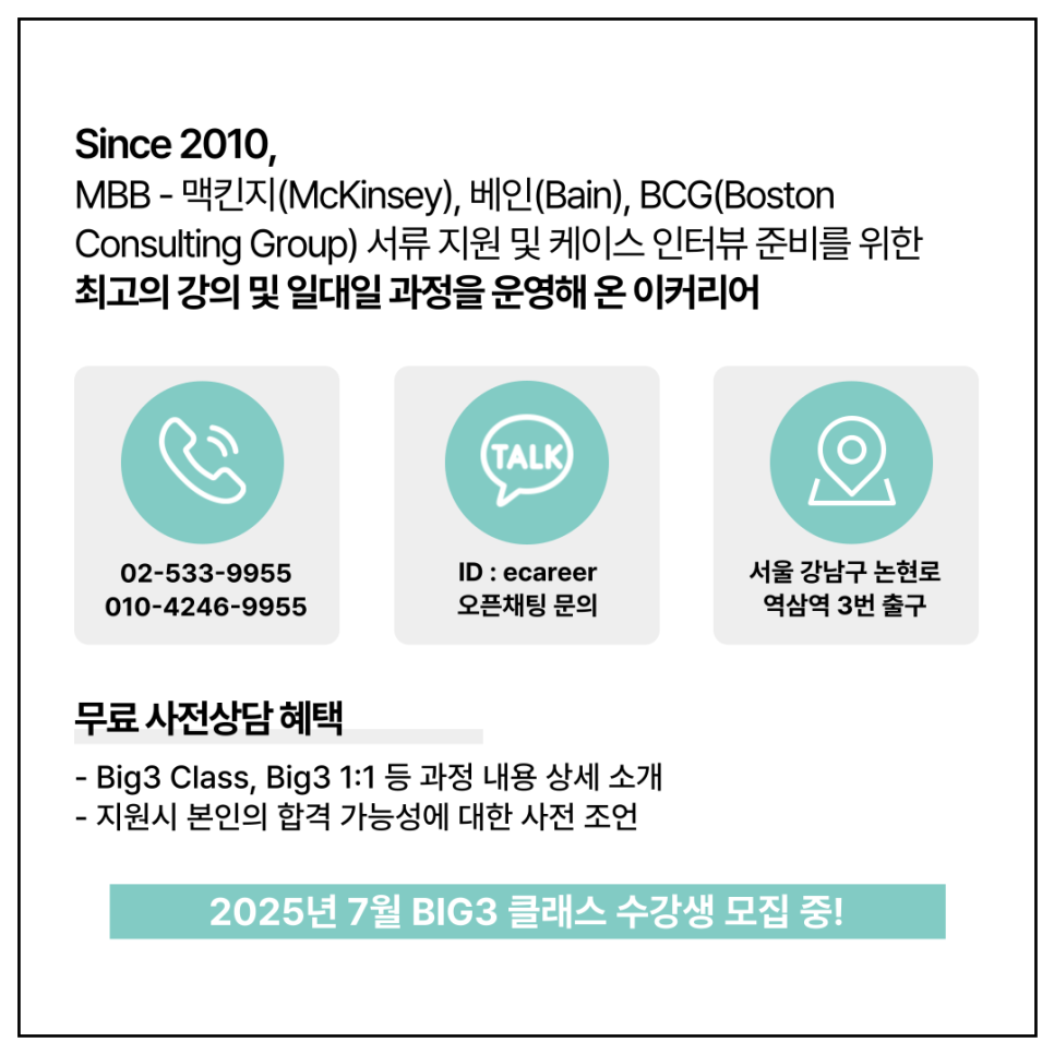 2025년 여름 Big3(MBB) Class(컨설팅펌 입사대비 과정)이 2025년 7월 5일(토) 개강합니다!